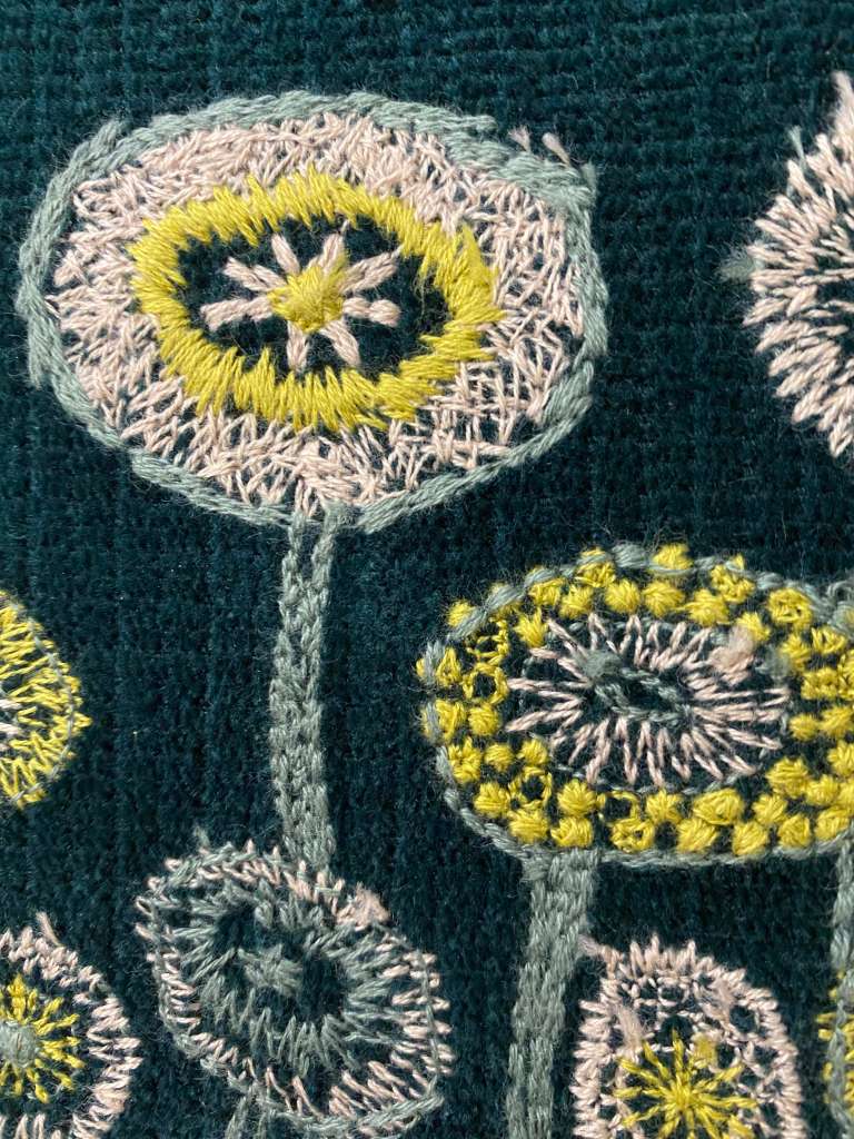 This is a preloved Hobonichi cover featuring Japanese Designer brand Minä Perhonen proprietary textured cotton fabric exterior and light beige faux leather (Polyurethane) interior. It has a dark green background with embroidery mimosa. The Hobonichi cover comes with the “butterfly pen loops” which allow a user to ‘lock’ the cover in place by slotting a pen through the two pen loops.